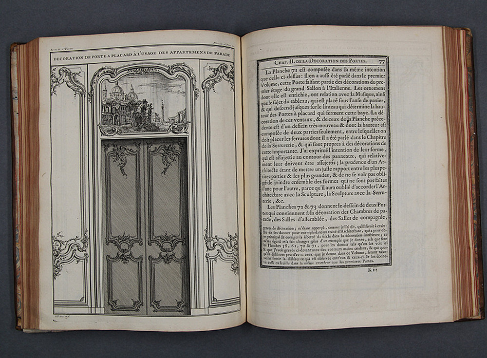 Jacques-François Blondel (1705 bis 1774), Autor des Werks Distribution des Maisons de Plaisance (Band 2), entstammte einer Pariser Architektendynastie. Sein Onkel, Jean-François Blondel (1683 bis 1756), unterrichtete den jungen Jacques-François in klassischer Architektur. Dieser begann seine Karriere als Kupferstecher architektonischer Motive und wurde einer der wichtigsten Lehrer für Architektur im Frankreich des 18. Jahrhunderts. Dieser Band enthält 44 zum Teil ausfaltbare Kupferstiche.
